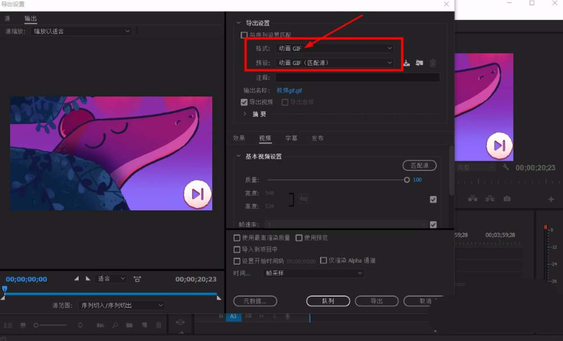 4、调整导出设置:在导出设置中,选择“格式”为“GIF”,并根据需要调整其他参数,如分辨率、帧速率等。