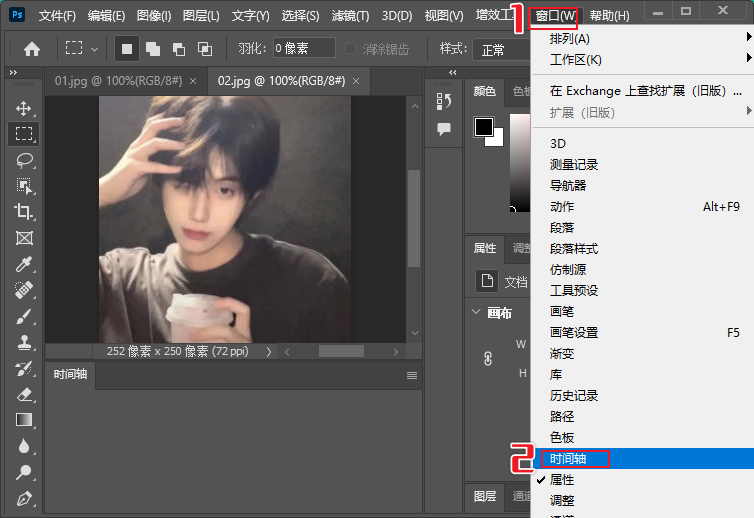 1、打开PS,点击“窗口→时间轴→创建帧动画”。