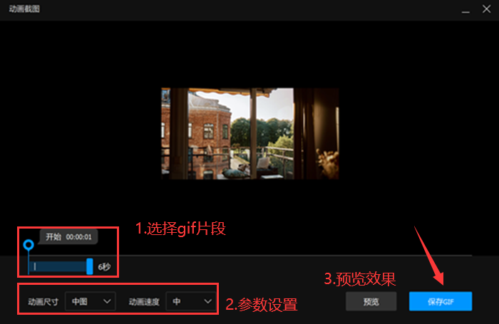2、选择“GIF动画”功能,设置截取时长(最多20秒)和尺寸(建议1080x720)。