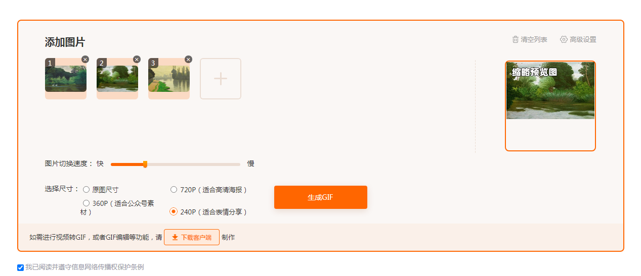 2、调整图片顺序、尺寸和帧间隔(延迟值越小切换越快)。