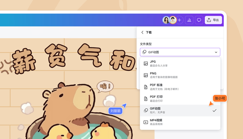 3、点击“导出”按钮,在格式选项中选择“GIF”。