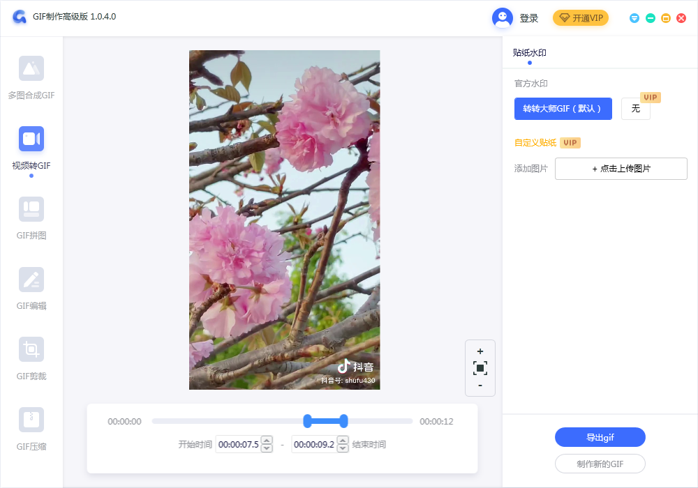 3、在编辑界面中修剪多余部分,点击“导出”生成GIF。