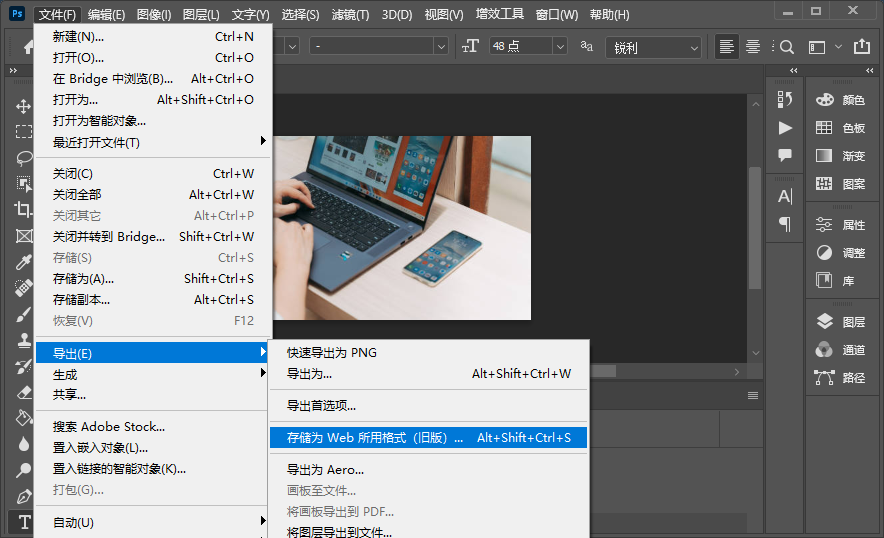 3、导出设置:选择「文件」→「导出」→「存储为Web所用格式」格式选「GIF」,颜色选「128位」,勾选「透明度」