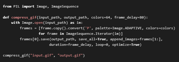 - fromPILimportImage, ImageSequencedefcompress_gif(input_path, output_path, colors=64, frame_delay=80):withImage.open(input_path)asim:frames = [frame.copy().convert('P', palette=Image.ADAPTIVE, colors=colors)forframeinImageSequence.Iterator(im)]frames[0].save(output_path, save_all=True, append_images=frames[1:],duration=frame_delay, loop=0, optimize=True)compress_gif("input.gif","output.gif")
