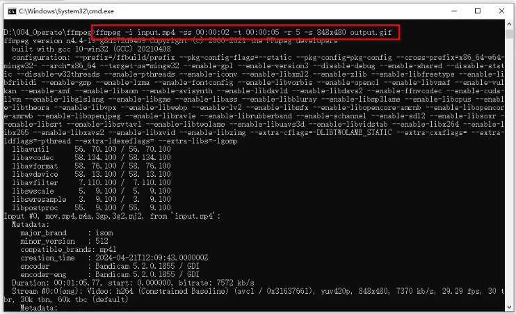 3、# 截取片段(5秒示例): ffmpeg -ss 00:00:10 -t 5 -i input.mp4 -vf "fps=12,scale=800:-1" clip.gif
