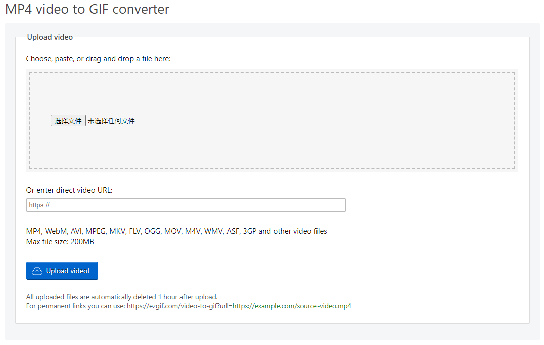 1、访问 EZGIF 官网,点击 "Choose File" 上传视频