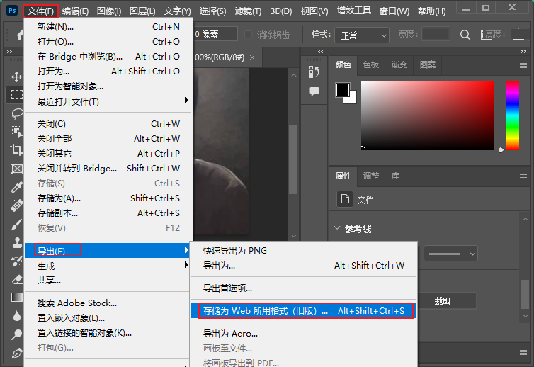 - 完成动画后,点击 “文件” > “导出” > “存储为Web所用格式”。