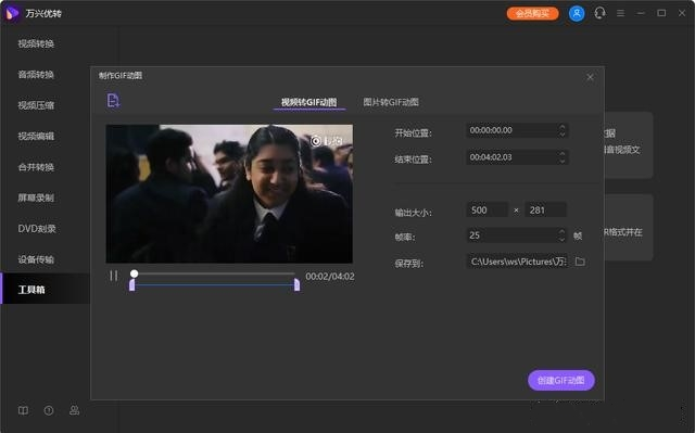 - 视频转GIF:选择视频文件,截取需转换的片段并设置帧率。
