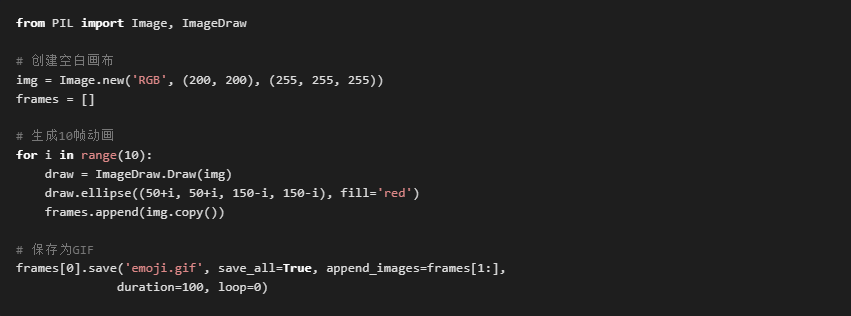 pip install pillow - 控制帧间隔(duration参数)