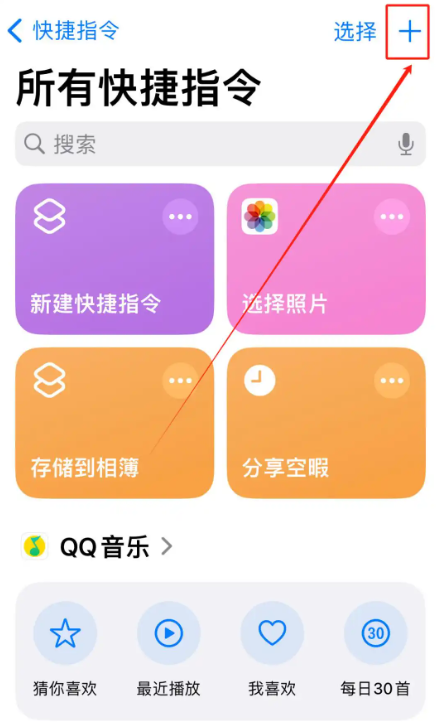 2、创建新快捷指令:点击右上角的“+”号,创建一个新的快捷指令。