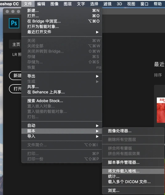 3、使用脚本处理多文件:点击"文件"->"脚本"->"将文件载入堆栈",一次性导入多张图片作为图层。