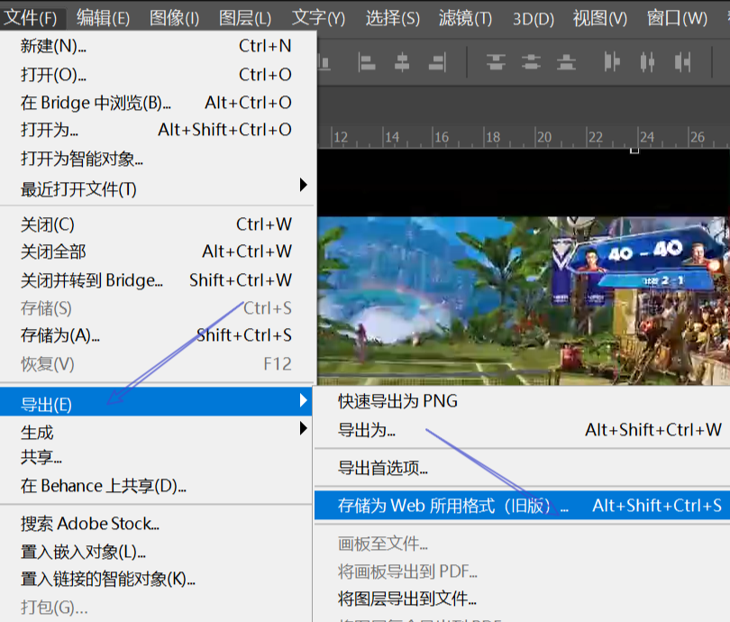 9、导出GIF:点击菜单栏的"文件"->"存储为Web所用格式",