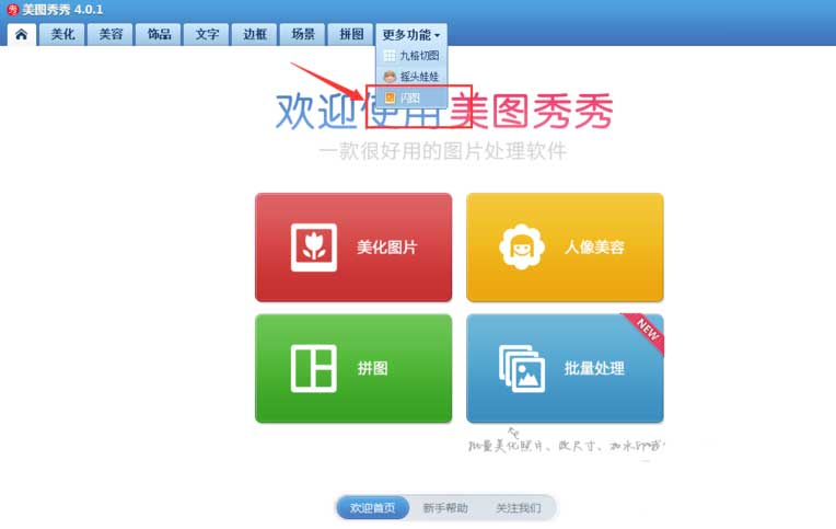 2、进入GIF制作功能:进入首页,选择“更多功能”, 这时弹出菜单栏,点击选择闪图,