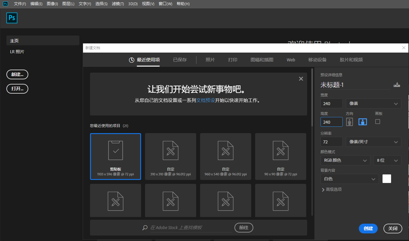 1、新建文件:打开PS,点击“文件”→“新建”,设置画布尺寸(如240x240像素)。